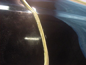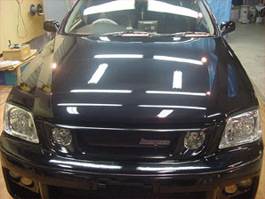 今回は過去最高のペンキ装着車が入庫しております。多い・強い・固いと3拍子揃った兵です。 厳密には普通のペンキミストではなく、タイル用のクリア塗装(コーティング?)だそうです。 さすがに厳しい自然環境の中で壁面の保護を目的として塗られるものだけあってなかなか頑固です。 粘土では全く歯が立たず、通常使用しているミスト除去用の溶剤も思った程の効果がありません。 オーナー様はいろいろなお店で断られて、半ばクリア層の全塗装をお考えだったとか・・・ しかしながら、塗装屋さんにまで何件かお断りされたようで、困り果てていたところ当店に辿り着いたと。 このお車は、34ステージアのオーテックバージョン260RSというちょっと特殊なお車です。 知る人ぞ知るRB26エンジンを搭載しており、当時ステージアの皮を被ったGT-Rと話題になった程です。 しかもカラーはタマ数の少ないブラックパール、走行距離は2万キロ台の屋内ガレージ保管と マニアにはよだれものの逸品です。オーナー様もそれはそれはとても大事にされていて、 できればオリジナルの塗装を残しておきたいと強い願望をお持ちでした。 当店がお断りしたら間違い無くこの車は何も悪いことをしていないのにオールペン、んー何とかしてあげたいが・・・ メールでご相談を受けてお返事を出したところ、次の日にはわざわざ大田区よりすぐにでも見せに行きたいと 足取り軽くお見えになったこと、実際にお会いしてお話を伺い、オーナー様のこのお車に対する心遣いが 伝わってきたこと、時間はいくらかかっても良いとのことより、とりあえず1番ひどい左のクォーターパネルで あれやこれやと試してみて、どうしてもダメなら申し訳ないがお断りしますとの条件で、思いきって引き受けました! さてさて引き受けたのは良いがどうしましょう?頭を悩ませております。 オーナー様がビックリして喜ぶ顔をイメージしつつ、慎重に作業を進めておりますが、 どうにもこうにも時間がかかります。1日かけて1パネル除去できるかどうかの代物です。 これから暑い日が続きますので、とてもとてもつらい日々が続きますが、完成を夢見て頑張りま~す(^ ^)/ 時々途中経過をUPしますので楽しみにしていてくださいねー!
